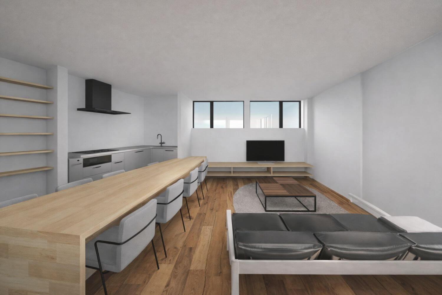 その内側には、吹き抜けと大開口によって、上下階に光を届ける開放的な空間が広がります。